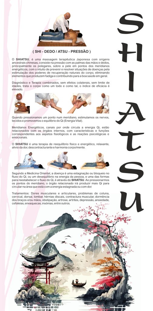 O Shiatsu, massagem terapêutica Japonesa, consiste na pressão com as palmas das mãos e dedos, principalmente os polegares, sobre a pele em pontos dos meridianos energéticos, com o intuito de prevenir e tratar doenças pela estimulação dos poderes de recuperação naturais do corpo.